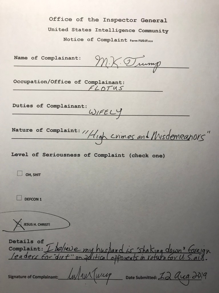 In a complaint filed with the Intelligence Community’s Inspector General’s office Aug. 12 — fewer than three weeks after the two presidents’ initial conversation — Mrs. Trump noted the seriousness and urgency of her unusual action, specifically mentioning in the document impeachment-related language “high crimes and misdemeanors” as well as this conclusion, “I believe my husband is shaking down foreign leaders” to provide Trump with information that would hurt his political rivals.