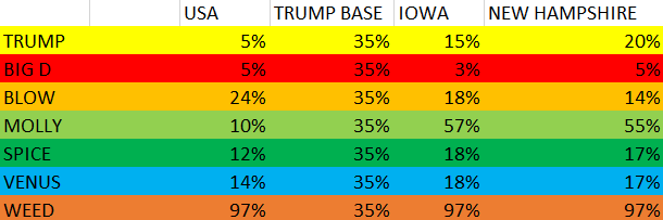 Across the broad spectrum of daily American life, Mathis said, “Trump pretty much loses by multiples of his own ratings. For example, sex. Whether we’re asking about circumstances for sex (angry, drunk, etc.), or positions or, in the case of Iowans, partners, Trump is behind by 18 or 20 to one. With drugs, marijuana wins by nearly 20 to one. Even (with) cocaine he’s down nearly five to one.”