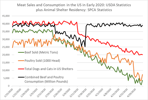 In the bottom chart, however, the downward impact of meat and poultry sales “are tracking in near lock-step” with the declining populations at animal shelters throughout the US, the USDA official said.