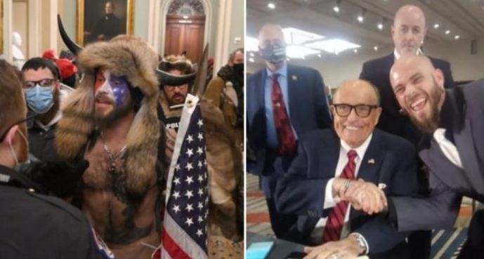 QAnon Shaman Guy, left, greets US Capitol Police officer during his visit to the Capitol Jan 6. He’s since been arrested in his home state of Arizona by US marshals. In picture at right, Trump’s personal attorney Rudy Giuliani congratulates Shaman Guy (out of uniform) on being selected for coveted fourth position on Mt. Ratsmore. (Photos by Fuzzy Koppelman Images)