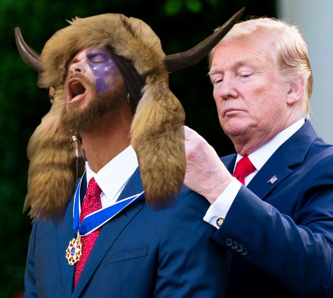 QAnon Shaman Guy receives Presidential Medal of Freedom from Orange Menace Jan 10, the day after he made bail, “in recognition of his contributions to the ‘Stop the Steal’ movement and threatening Nancy Pelosi with her life,” according to the official White House citation. (Photo by Rueters)