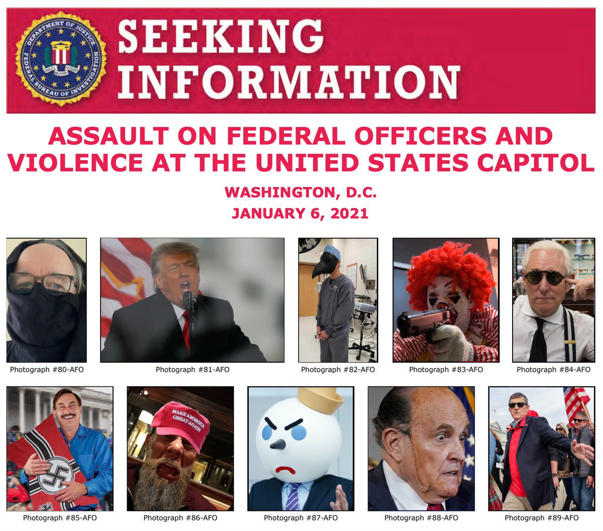 WASHINGTON (RUETERS) – The FBI announced today it has stepped up its aggressive hunt for additional suspects in the storming of the US Capitol nearly nine weeks ago, releasing its latest “Seeking Information” most-wanted poster containing a list of 10 decidedly “unusual suspects,” a Bureau spokesman told Rueters. “What a collection of kooks, creeps, crackpots, and conspirators,” he said. “A true amalgam of Trump’s America.”