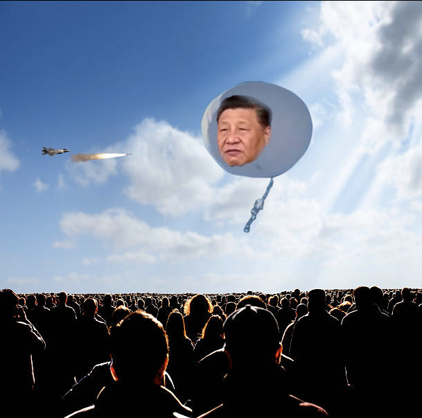 China Chief Meteorologist Xi Jinping insists Americans were only seeing “part of the story” of the so-called spy balloon when in fact, he claimed, “the whole mission was meant to be friendly.” At right Xi can be seen waving to Canadians from the other side of the balloon. “You see, you don’t hear the Canadians complaining. They liked me,” Xi insisted. (Photos by Fuzzy Koppelman Images)