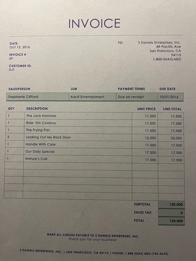 Cohen last week appeared before the new Manhattan grand jury and, in a surprise move, provided prosecutors from Bragg’s office what could be the “smoking gun” in their potential fraud case against the Orange Menace: An October 2016 invoice detailing what services were provided the real estate mogul and reality television star by the popular and versatile then-27-year-old porn actress during their one-night fling at a Los Angeles hotel.